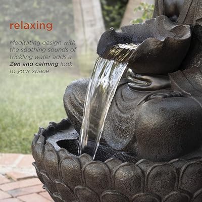 It comes with a water pump and a 6-foot long cord as well as LED lighting. Bring tranquility relaxation and whimsical beauty to your outdoor living area with this gorgeous Buddha patio fountain. The patio fountain features Buddha in stone finish sitting on a rectangular column and holding a pot while water cascades down to the base of the column. An elegant decoration that instantly turns any garden into a tranquil retreat.