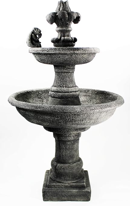 See More by Fleur De Lis Living. 635 H x 40 W x 1625 D. Fleur De Lis Living Danelle Resin Outdoor Fountain w Light Finish. Fleur De Lis Concrete 2 Tier Outdoor Garden Fountain This Wonderful Fleur De Lis Concrete 2 Tier Fountain is an elegant fountain.