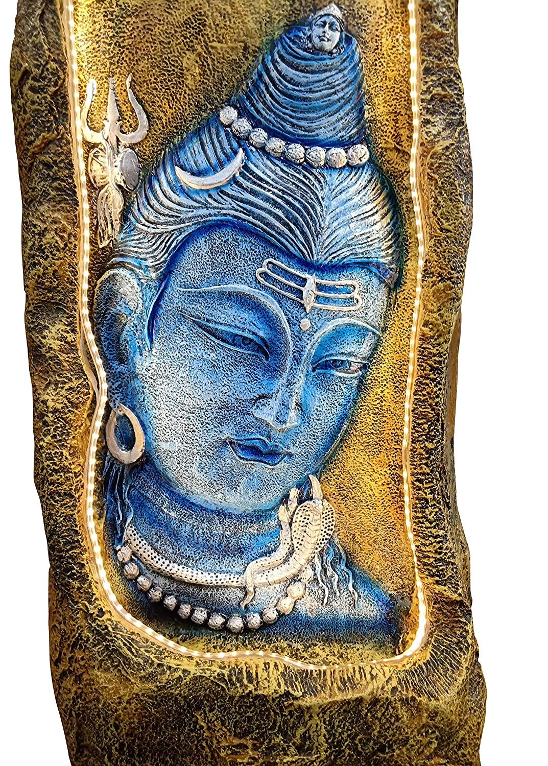 Made of good quality Fiber which makes it water and weather resistant. Lord Shiva fountain in antique color with the stone look and water falling made your place vibrant and peaceful. Includes a pump and an LED light illuminating the water flow. This is a beautiful indoor Lord Shiva water fountain for home decorHandicraft Water fountain showpiece for home and office decorcan be a beautiful gift itembeautiful multi colour Ball led lighting with water flow through water mini pump machineIt can be use indoor and outdoor purpose.