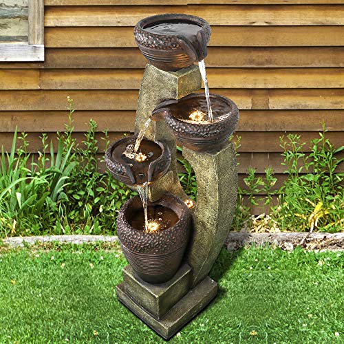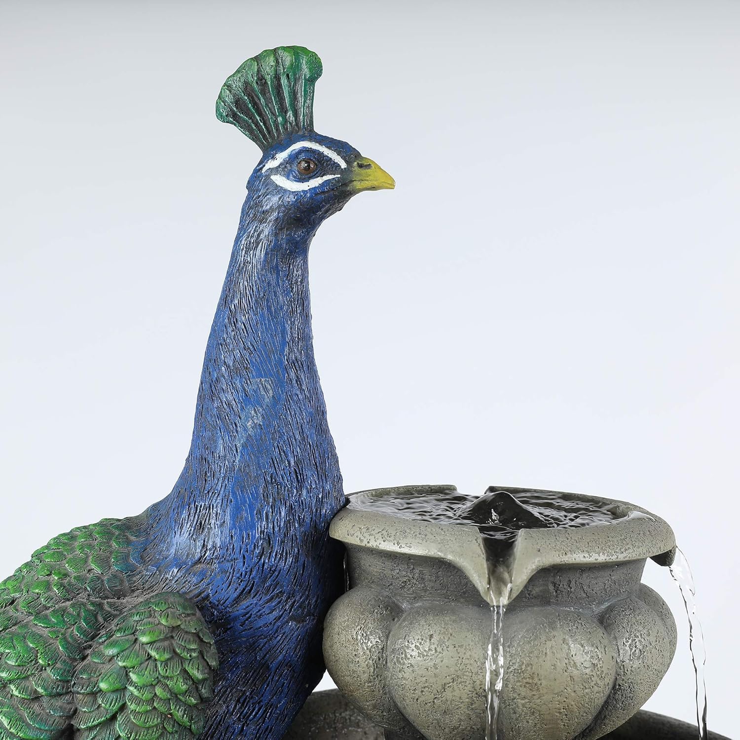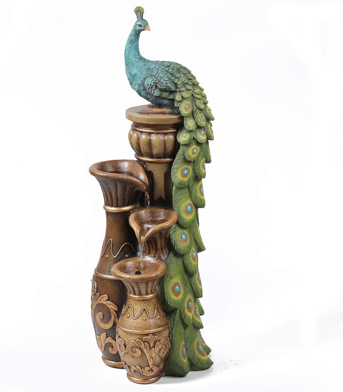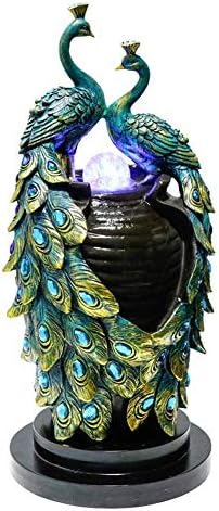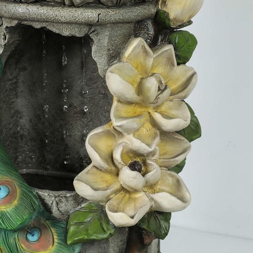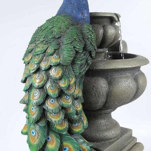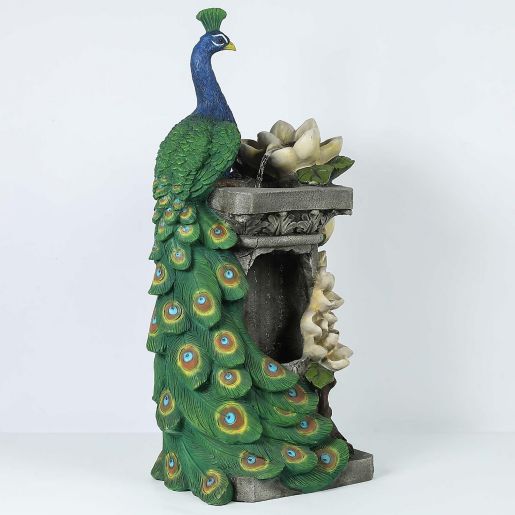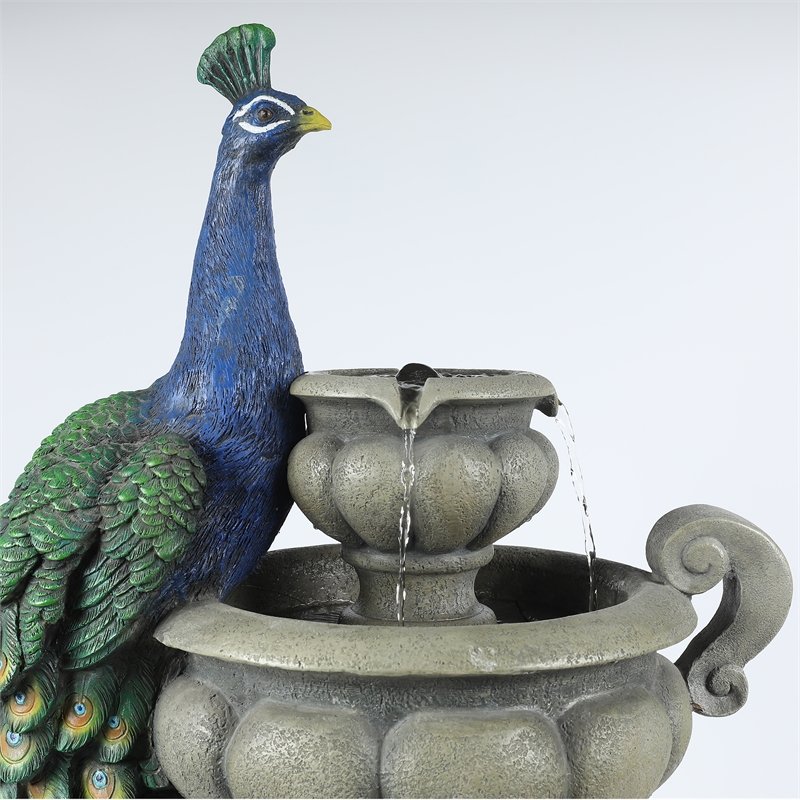 All of these details will make a warm addition to your outdoor living space. Chillscreamni 40 H Modern Outdoor Fountain - 4 Crocks Outdoor Garden Fountains with Contemporary Design for Garden Patio Deck Porch Backyard and Home Art Decor. This beautiful outdoor fountain features a dazzling blue peacock with lovely detailed tail feathers and LED lights in the resorvoir base. This beautiful outdoor fountain features a dazzling blue peacock with lovely detailed tail feathers.