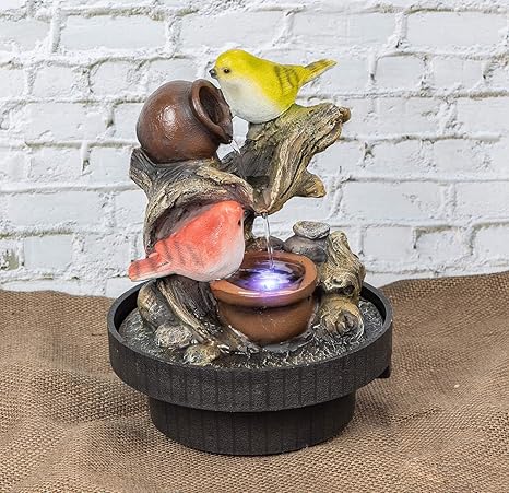 This beautiful tabletop fountain constructed in a natural stone look from polyresin is fit for both indoor and outdoor display. This tabletop water fountain with lights features non-slippery feet that make it stable and prevent tipping over and sliding on desktop surfaces. Hummingbird Table Fountain 1 Model ORE-12281L. Book Now to Avoid Disappointment.
