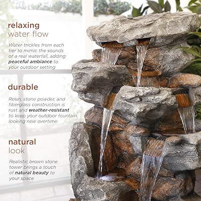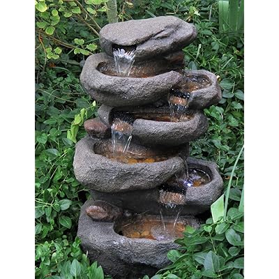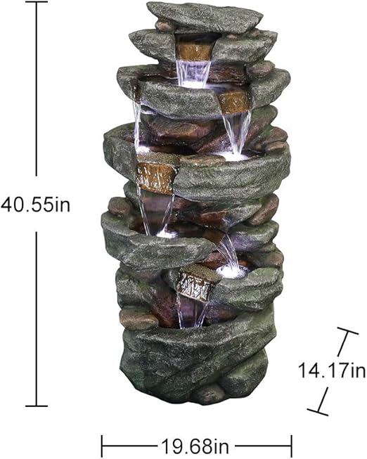 Rock Locking 5 Tier Cascading Outdoor Fountain with LED. Tall Outdoor 3-Tier Vintage Pump Barrel Waterfall Fountain Yard Art Decor. Is a handsome natural complement to adorn your porch deck patio or indoor locale. This rainforest garden water fountain has ideal dimension15length19width40height.