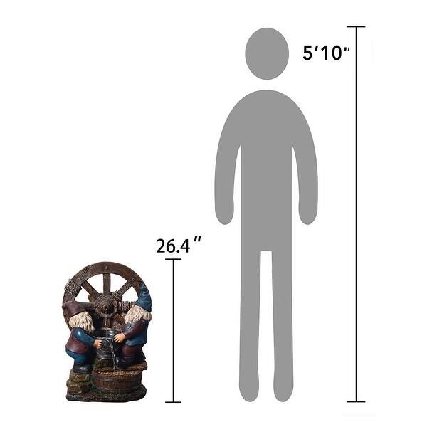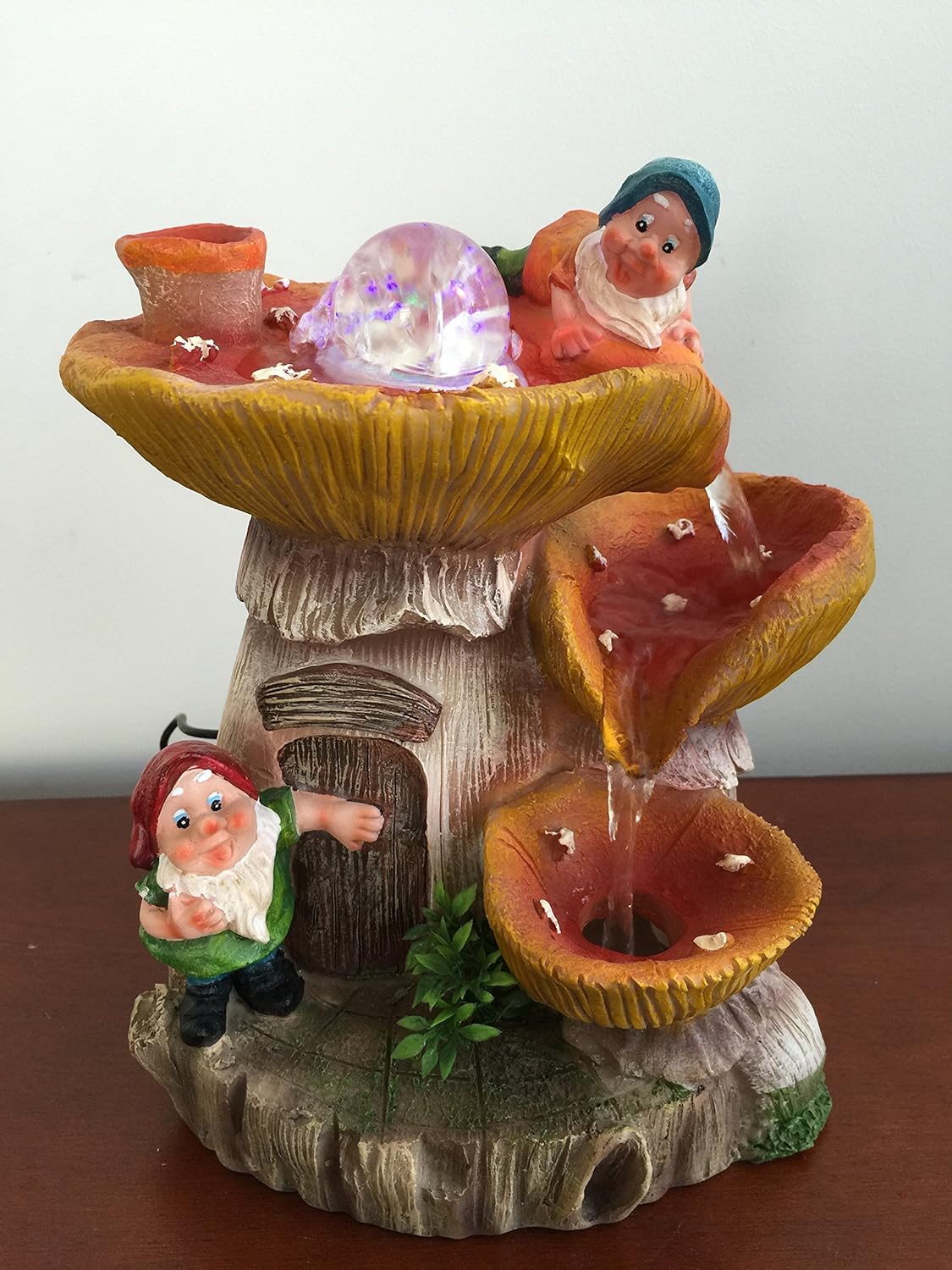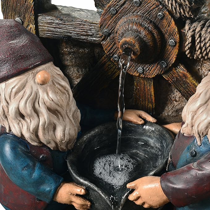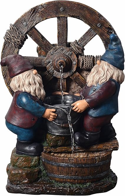 Return this item for free. Relax on a sunny day as the water cascades from the wooden looking wheel. Features two cute garden gnomes. I was thinking that this fountain was a cute little outdoor table top fountain that would be battery operated. Add a touch of fairytale magic to your garden with the Gnome Friends Fountain.